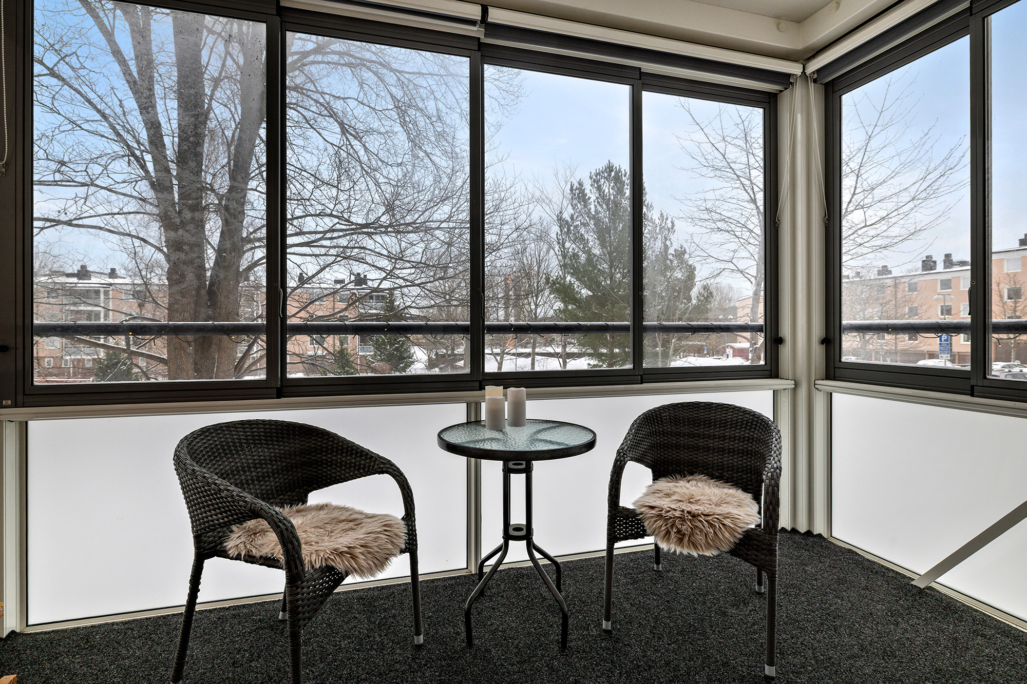 Stor och inglasad balkong med utgång från vardagsrummet. Heltäckningsmatta på golvet och skjutbara fönster med rullgardiner på alla fönster. Här ryms större möbler och med fin utsikt över omgivningarna.
