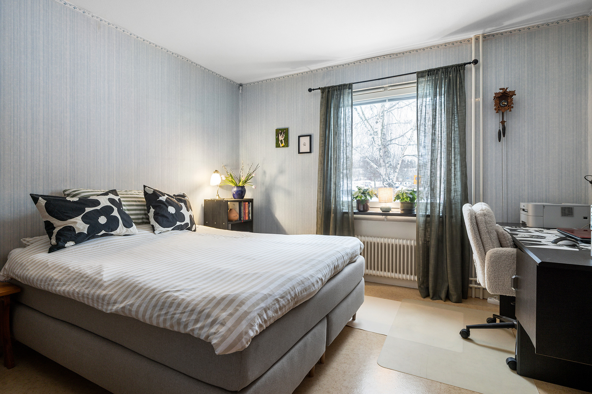 Sovrum som rymmer dubbelsäng, nattduksbord och övriga möbler som exempelvis en kontorshörna. Matta på golvet och ljus tapet på väggarna.