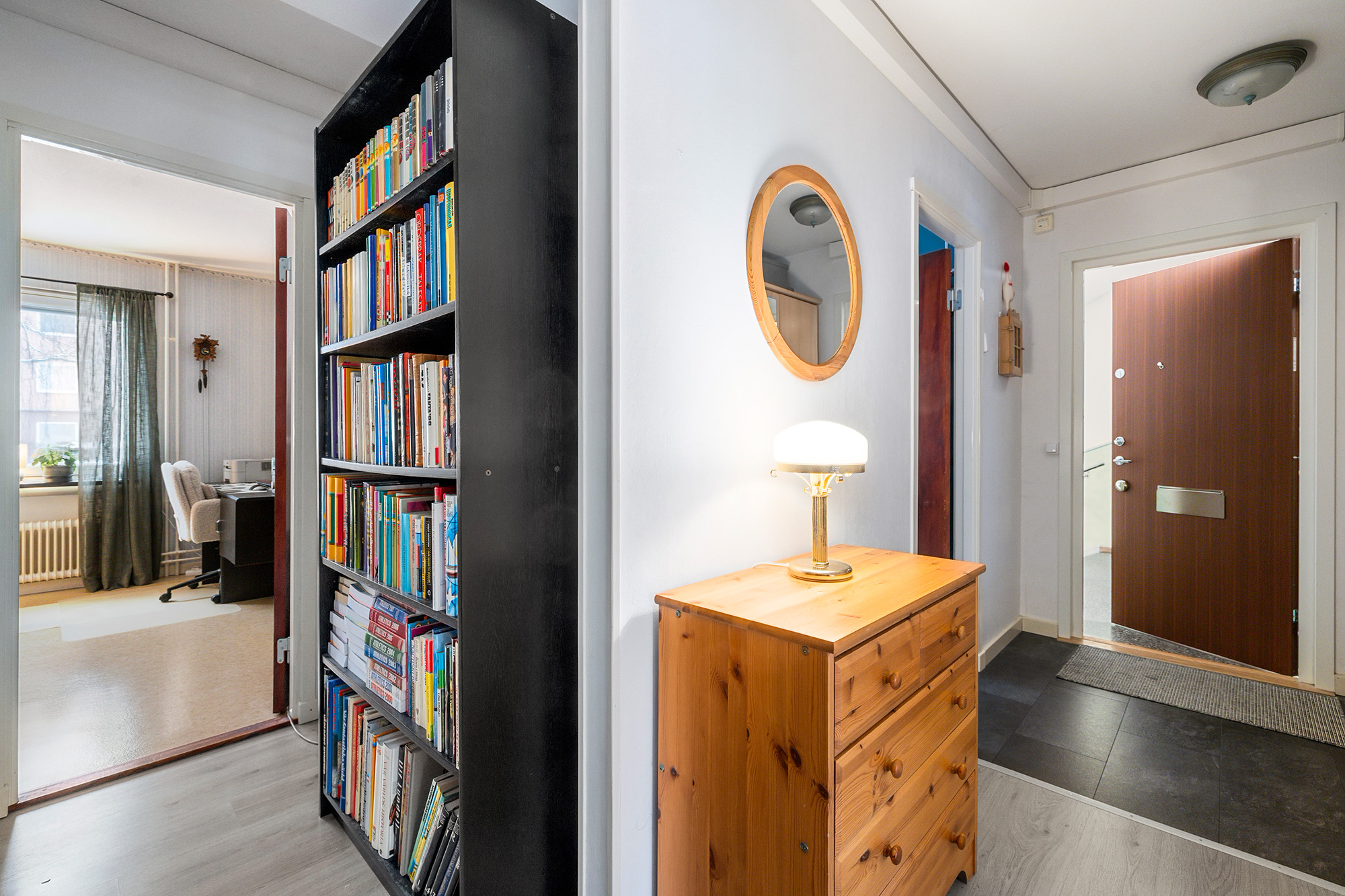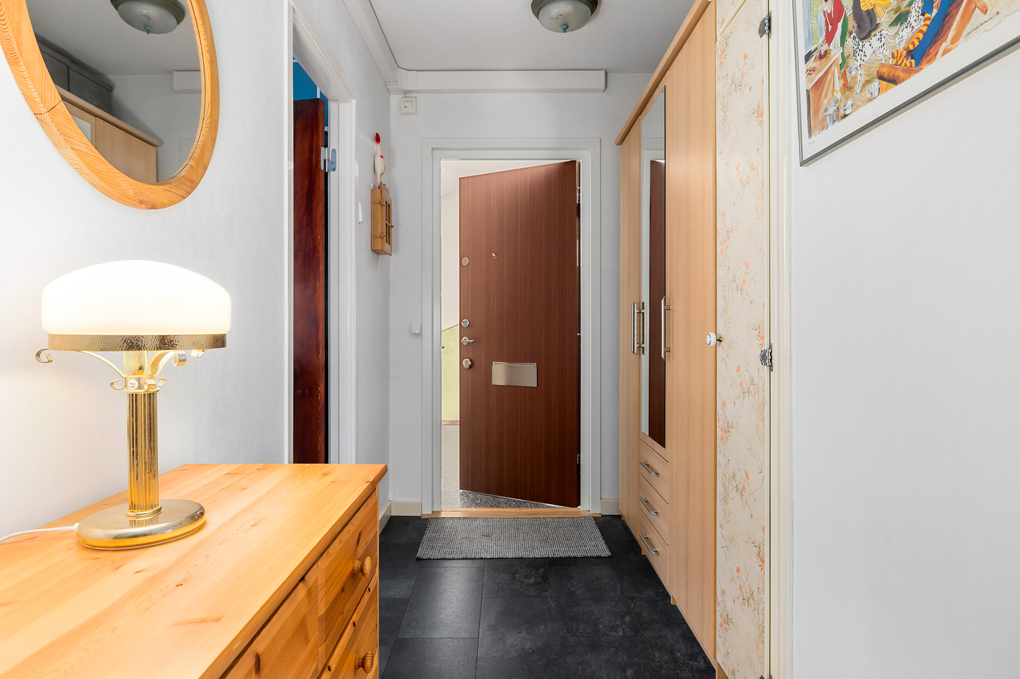 Praktisk och välkomnande hall med plats för klädhängare och skoställ samt förvaringsmöbler. Längre in i hallen finns två inbyggda garderober och även en klädkammare som tillsammans ger mycket bra förvaringsmöjligheter. Trälaminat på golvet och ljusa väggar.
