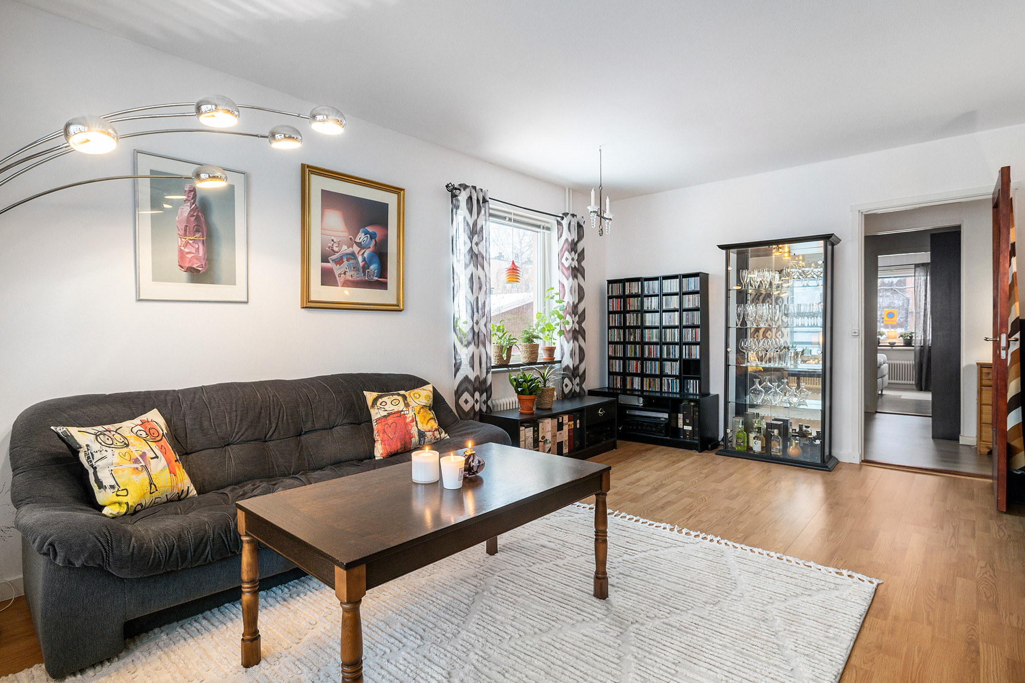 Lägenhetens gavelläge ger ett mycket trevligt vardagsrum med fönster i två väderstreck. I denna lägenhet nås dessutom balkongen från vardagsrummet vilket skapar en trivsam gemenskapsyta. Den inglasade balkongen rymmer större möbler. Vardagsrummet har flera möbleringsmöjligheter för TV-hörna och extra matbord mm. Trälaminat på golvet och vitmålade väggar.