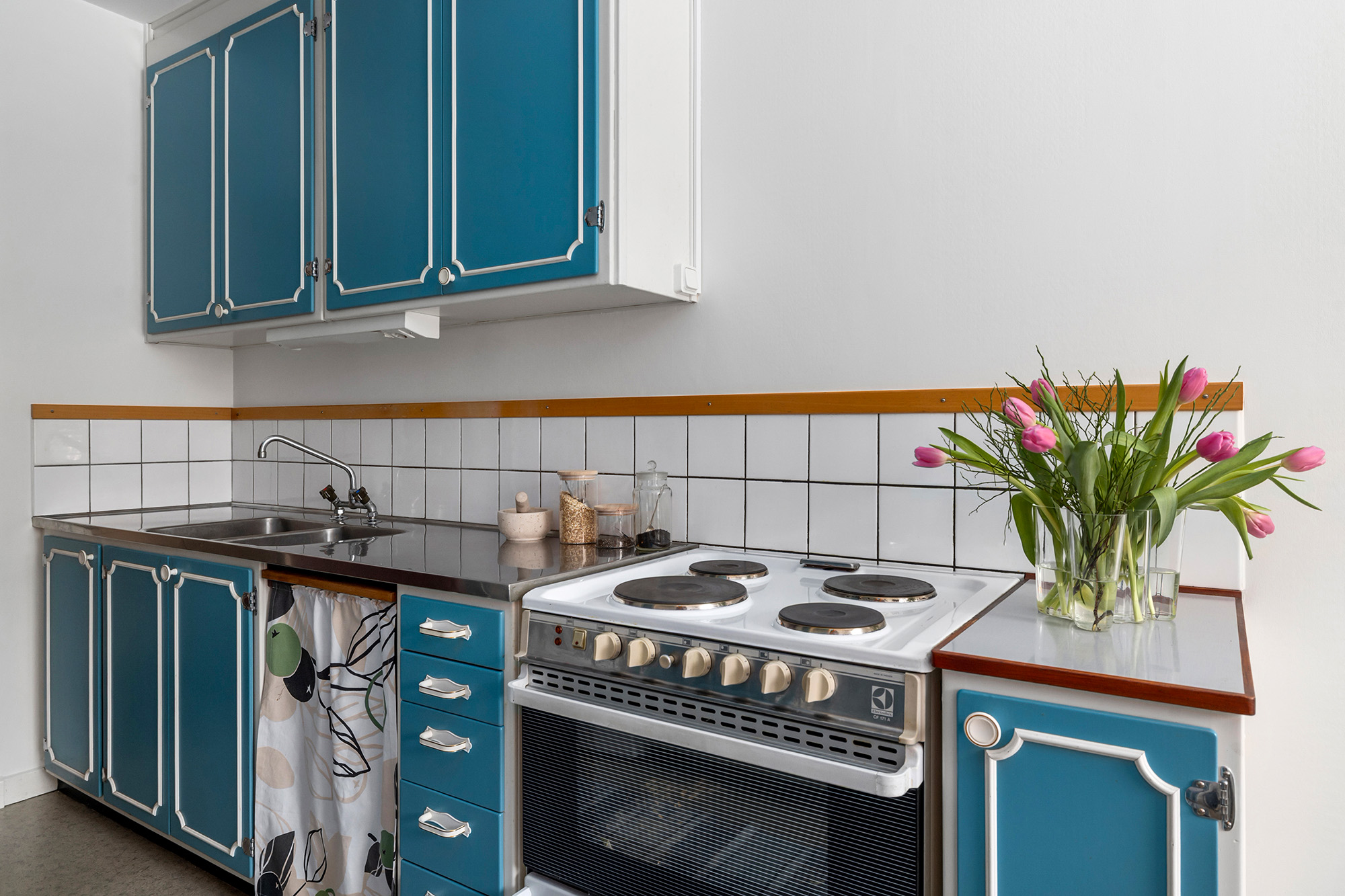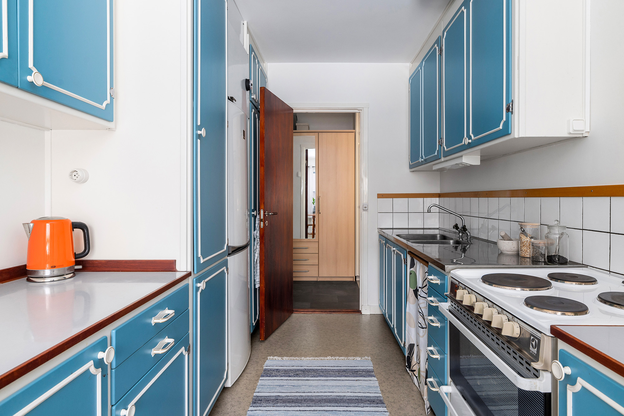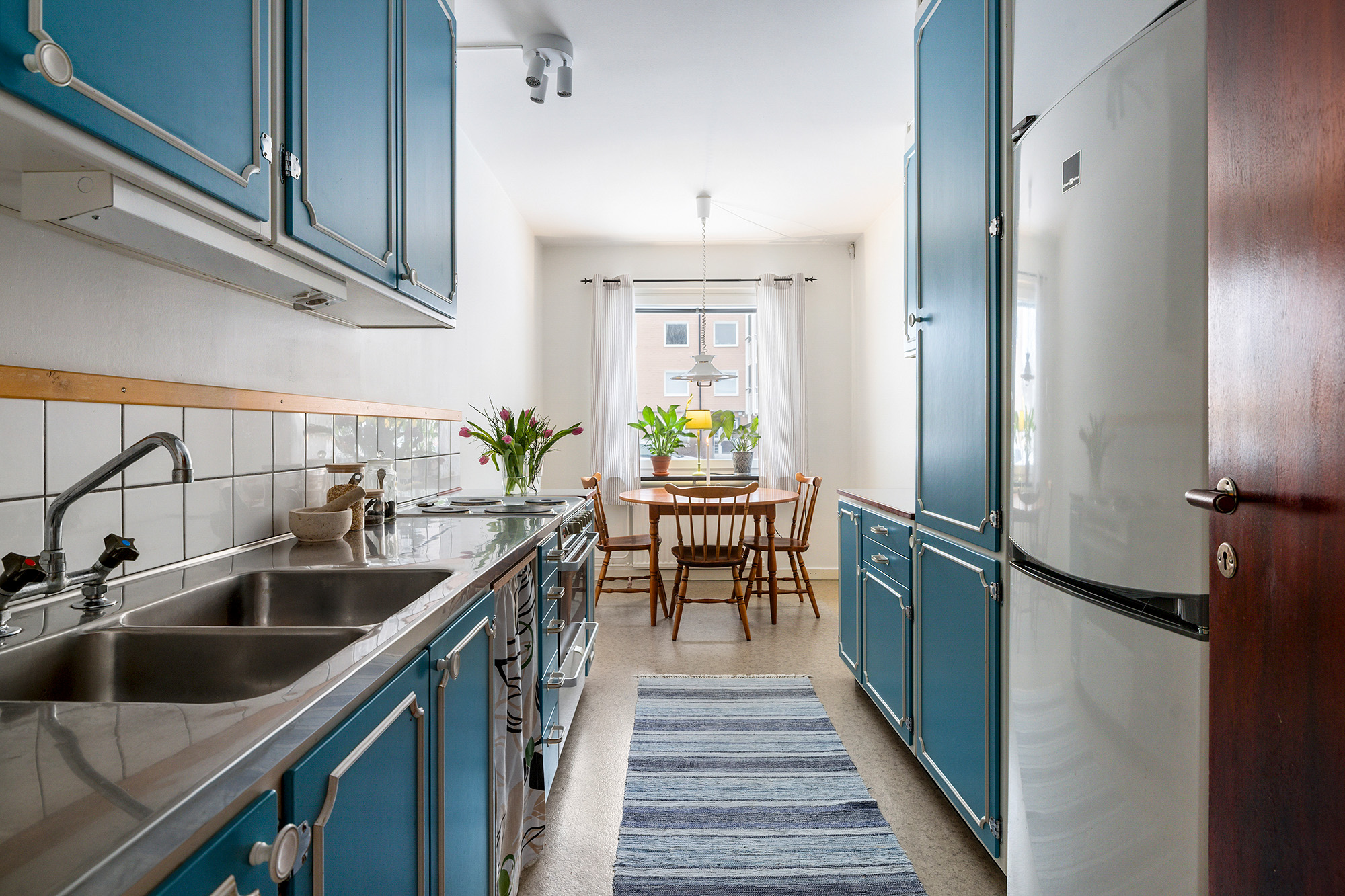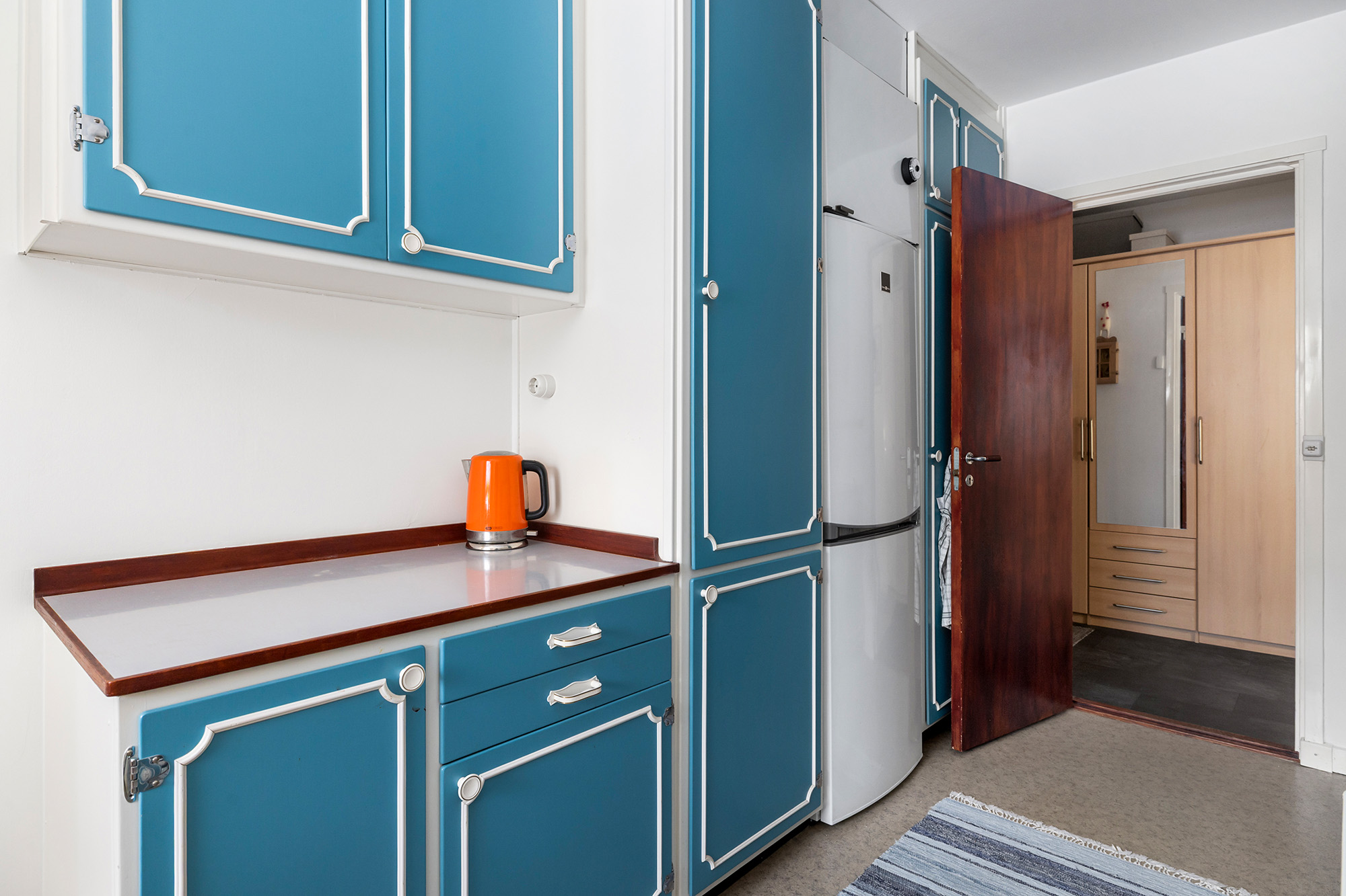 Kök med matplats för 4-6 personer. Väggar målade 2026. Här finns gott om arbetsyta och förvaringsmöjligheter. Ugn med spis och kyl/frys.
